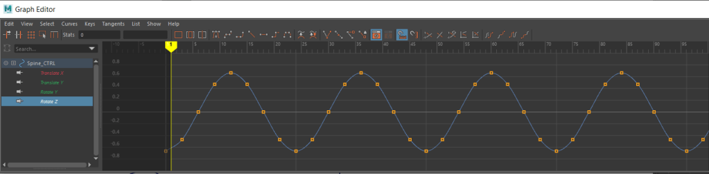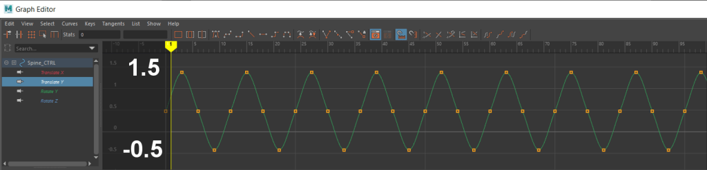 The spine translation along the Y axis factors in the inverse Weight parameter. The sine wave graph that results shifts between higher and lower average values depending on whether the Weight is low or high respectively. An example of the Translate Y animation graph for a low Weight value can be seen in the second image below.