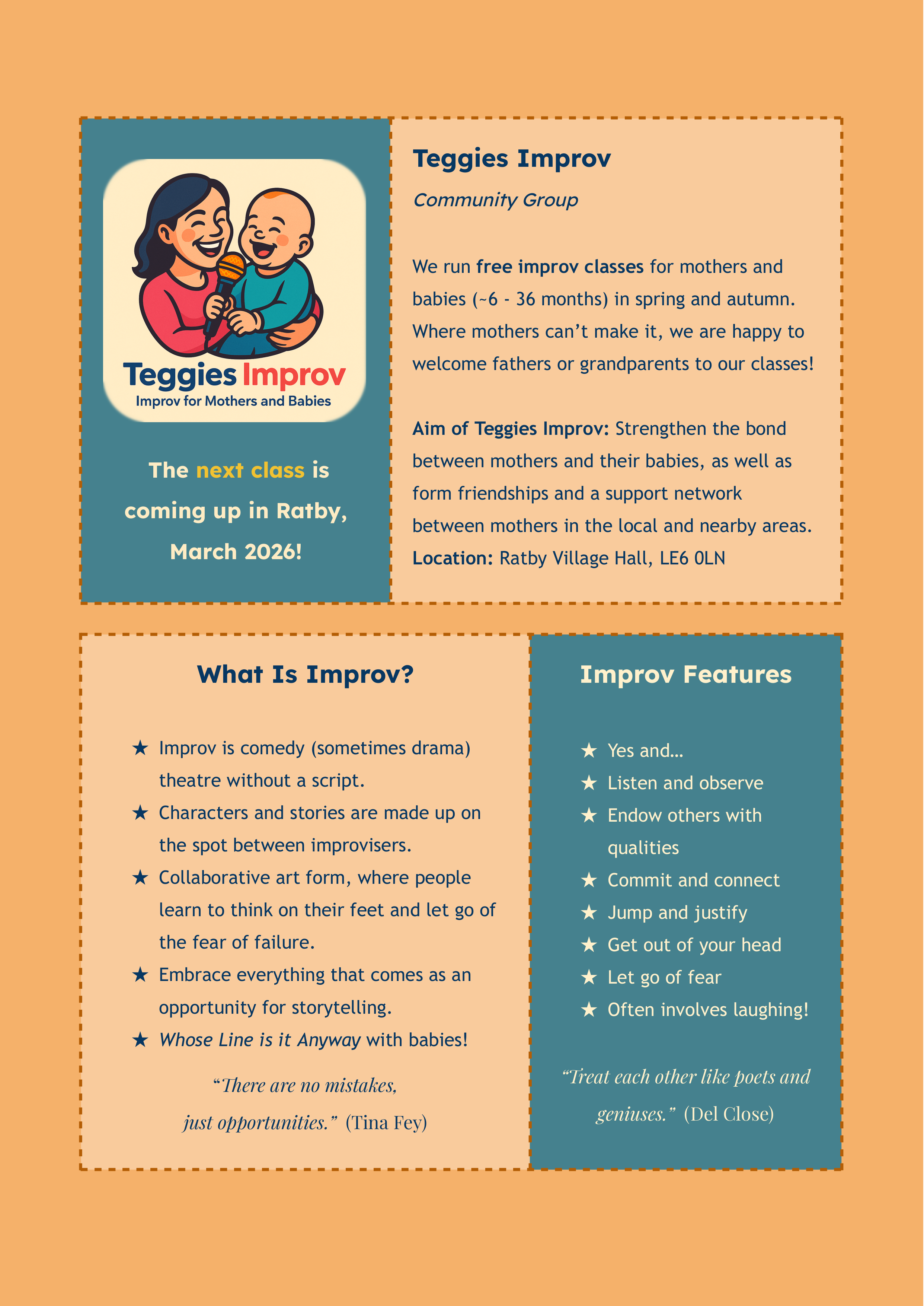 Aim of Teggies Improv: Strengthen the bond between mothers and their babies, as well as form friendships and a support network between mothers in the local and nearby areas.
