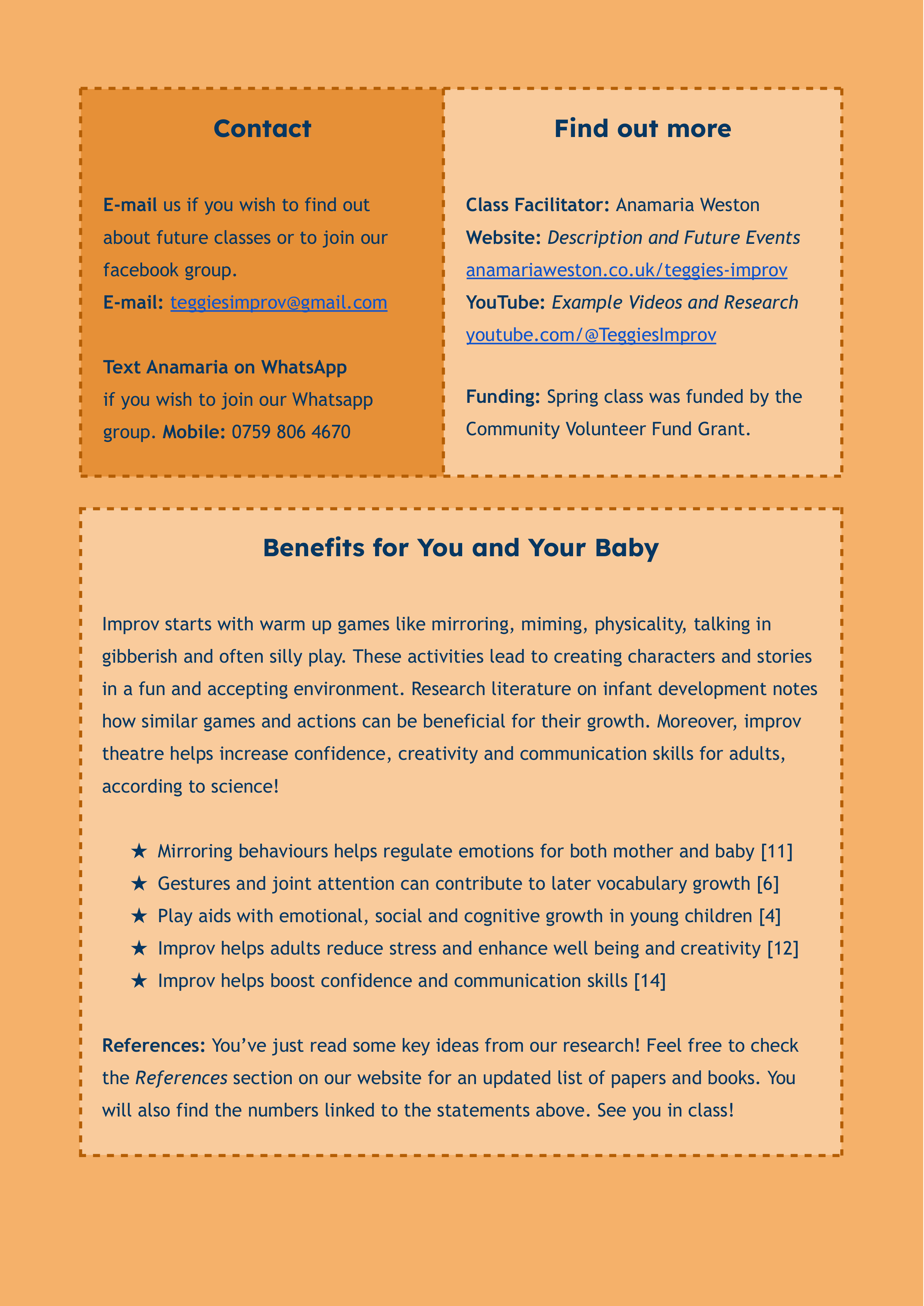 Teggies Improv Community Group is not-for-profit and runs free improv classes for mothers and babies (~6 – 36 months) in spring and autumn. Where mothers can’t make it, we are happy to welcome fathers or grandparents to our classes!